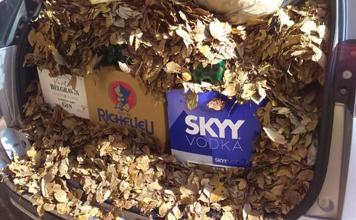 In a picture that was published by the Gauteng Community Safety department, a motorist was caught with a boot full of raked leafs and alcohol stashed underneath.
